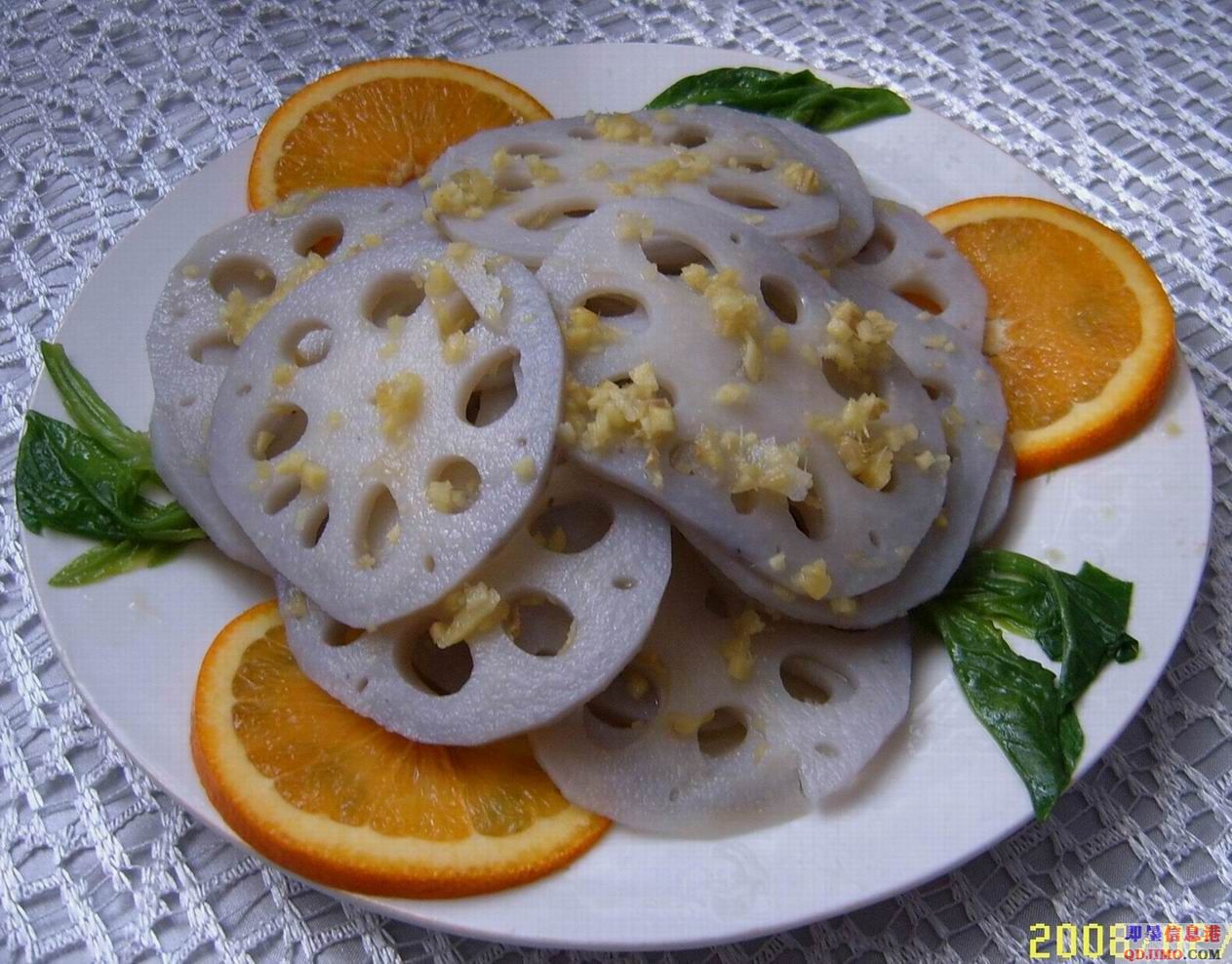 将藕片沥净水,依次加入姜末、糖、醋、鲜橙汁、盐(糖、醋以自己口味为准)调匀即可。