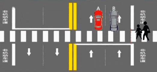 行人越过机动车道、非机动车道分割线,进入上述位置,机动车A、B未停车让行的,属于违法行为,应当处罚。