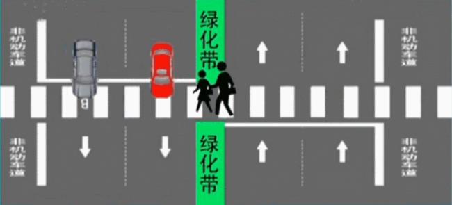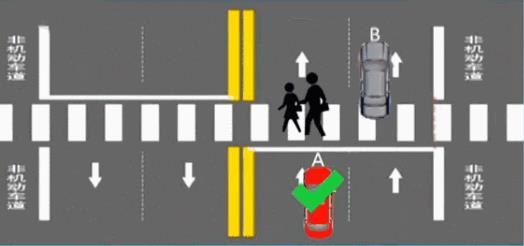 道路中央采用绿化带隔离,行人在道路中央驻足区等待的,机动车A、B应当减速行驶,可在确保安全的前提下通过人行横道。
