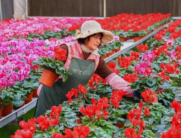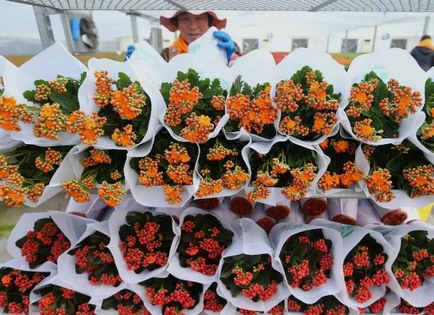 近日,山东省青岛市即墨区灵山街道花卉大棚里一片忙碌,种植户们忙着管护和销售花卉。近年来,即墨区灵山街道因地制宜推动花卉产业标准化、规模化、智能化发展,依托“龙头企业+农户”联农带农机制,大力发展花卉种植,打造集组培育苗、现代化种植、电商销售于一体的产销模式,带动农民增收,助力乡村振兴。
