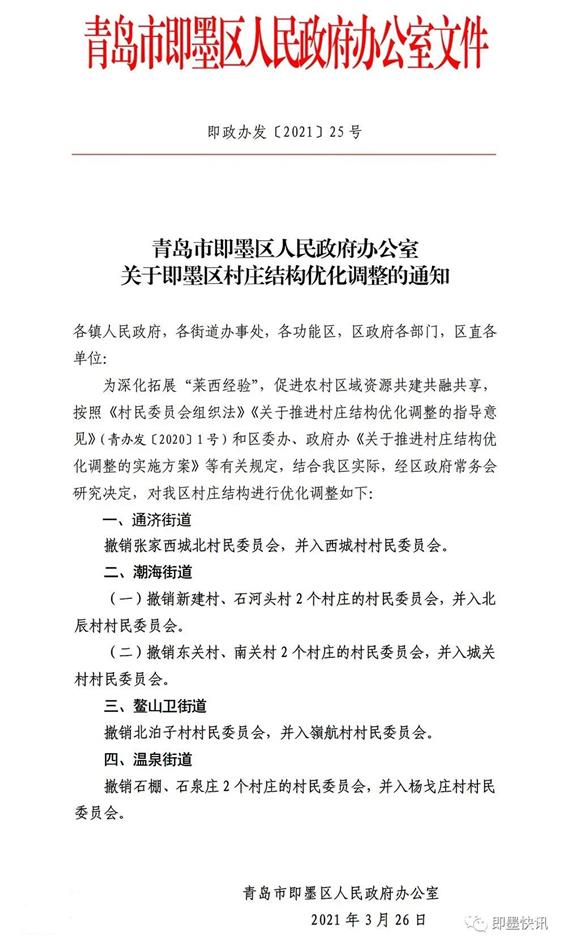 即墨发布村庄结构优化调整通知!这八个村委会被撤销!