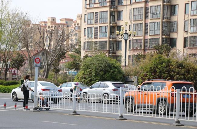 镜头二:一无抓拍路口,母亲推着婴儿车等了5分钟 下午1时30分,记者来到位于鹤山路信特名苑处的人行横道。该地点无违法抓拍设备,同时,因该路段是连接即墨东西部城区的主干道,车辆较多且车速较快。
