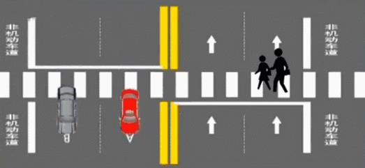 道路中央采用绿化带隔离,行人在道路中央驻足区等待的,机动车A、B应当减速行驶,可在确保安全的前提下通过人行横道。