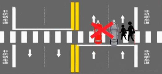 行人越过机动车道、非机动车道分割线,进入上述位置,机动车A、B未停车让行的,属于违法行为,应当处罚。