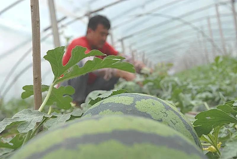 4月12日,即墨区段泊岚镇大吕戈庄一村,农民采用“秸秆反应堆”技术种植的2000余亩西瓜提前上市。