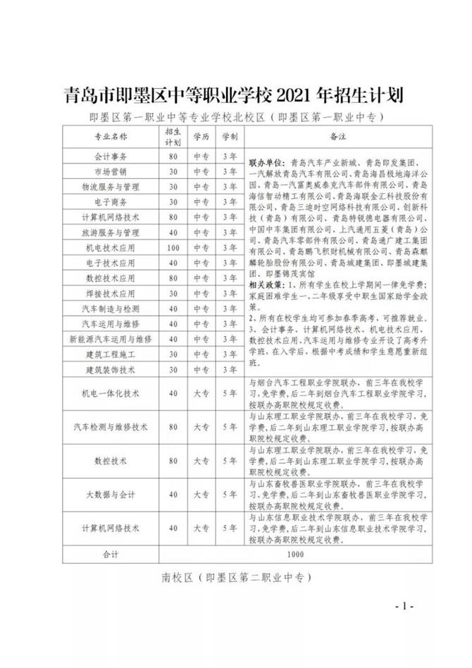 4月22日,即墨区教体局发布中等职业学校招生通知,2021年,即墨区共有初中毕业生14362人,共计划招收中职学生6000人,其中即墨区第一职业中等专业学校(北校区、南校区)计划招生1560人。民办职业学校青岛兴华汽车工程学校计划招收中专生500人,民办职业学校青岛中云经济贸易学校计划招收中专生500人。职业学校面试时间将于5月10日至5月16日进行,职业学校录取情况查询及公布所报考专业的分数线,将于7月下旬进行。