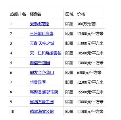日前,即墨三居室排名结果出炉,据房天下研究院数据统计,即墨含有三居室楼盘共有60个,其中最受关注的楼盘为天泰桃花源。据了解,该楼盘位于即墨,已于2019年7月开盘,价格为360万元/套。此外,三盛国际海岸、天泰·天空之城、天一仁和珑樾雲谷、海信千亩园、即发金色华山、华发四季、嶺海香澜郡瑜院、省房万豪庄园、德馨海棠公馆也入榜。