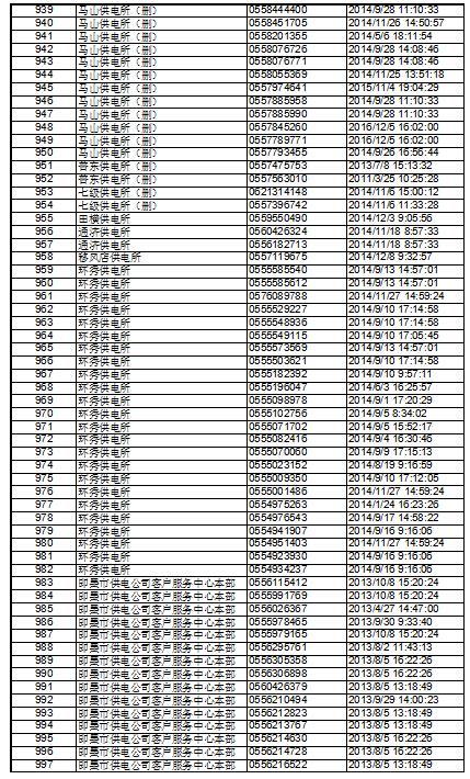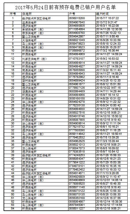 因提供账号错误、打款失败、联系信息失效、证明材料不齐全等原因,导致部分客户办理销户后,电费账户余额未成功退费。现将销户满3年客户的相关信息进行公示,请名单中的客户于2020年7月31日前到所属供电所办理退费业务。