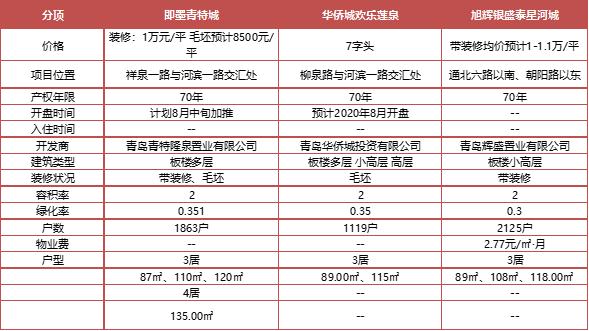 从项目规模来看, 即墨青特城1863户、华侨城欢乐莲泉1119户、旭辉银盛泰星河城2125户以后来者旭辉银盛泰星河城住宅规模为最大,华侨城整体占地产业占比较高,住宅1119户,规模适中。即墨青特城建面28万多方,总计1 863户,自建约1万平商业,配套邻里中心及活动场等,主打建面约87-135㎡户型。项目4月26日首开毛坯热销,而项目后期推出带装修产品,惠后均价在1-1.1万/平左右,计划8月中旬加推1#毛坯产品,主推建面89平、114平户型,起价7800元/平起,预计均价在8500元/平左右。7字头起价8字头均价与华侨城欢乐莲泉首期将推的产品释放的价格基本一致。