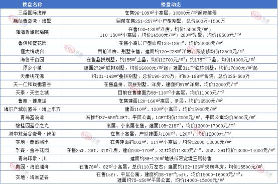 蓝色硅谷板块热盘:三盛国际海岸在售96-109㎡小高层,10800元/㎡起带装修;融创青岛湾·海墅目前在售251-257㎡小户型别墅,总价600-1500万;恒大悦珑台目前洋房、别墅在售,建面约120-228㎡洋房,带装修均价13500元/㎡;海尔产城创蓝谷·海上东方建面110㎡、120㎡小高层,均价15900元/㎡;青岛印象·川建面约88-120㎡地铁低密宽境三居待售;鲁信和璧花园在售小高层户型面积123-136㎡,均价23000元/㎡;海信千亩园在售叠拼别墅,约155㎡上叠,均价12700元/㎡;约175㎡下叠,均价14000元/㎡;天一仁和珑樾雲谷在售叠拼、双拼别墅、洋房,建面约97㎡洋房,均价12000元/㎡;鲁商·健康城在售建面120-160㎡高层、多层,均价16500元/㎡;碧桂园蓝谷之光高层、小高层在售,建面105-218㎡,均价13000-17000元/㎡;实地·海棠蓝谷在售loft、平层公寓,建面约38-78㎡loft,均价15000-16000元/㎡;建面约75-150㎡平层公寓,均价14000-15000元/㎡。