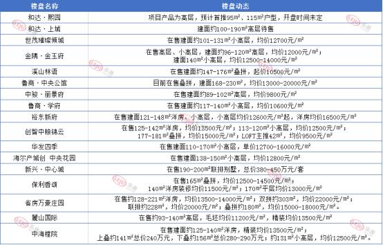 汽车产业新城热盘:即墨青特城建面约87-135㎡小高层,惠后均价10000元/㎡,计划8月中旬加推1#毛坯产品,主推建面89-114㎡户型,起价7800元/㎡起,预计均价在8500元/平左右;华侨城·欢乐莲泉建面约89-115㎡新品高层首开在即,起价低至7556元/㎡,目前已全城启动认筹;旭辉银盛泰星河城建面约89-118㎡小高层首开在即。