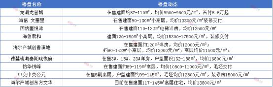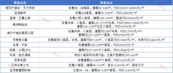 即墨西部国际商贸区热盘:海尔产城创·东方学府在售5#、6#高层,建面89-148㎡,均价15000-16500元/㎡;蓝城·玉蘭公馆在售10层小高层,建面125-190㎡,整体均价20000元/㎡;龙湖·天奕在售建面183-235㎡高层,均价20000元/㎡;招商·公园1872建面约127-167㎡小高层,均价15000元/㎡;金茂智慧国际城主推2#、6#,建面88-135㎡高层,均价11000元/㎡;中南紫云集在售装修小高层、洋房,建面约98-130㎡,小高层均价13600元/㎡,洋房均价14800元/㎡;中梁·拾光漫城规划小高层和洋房产品,主推户型面积100-160㎡;万科北宸之光在售小高层,建面89-110㎡,起价11200元/㎡,装修交付;海尔产城创翡翠公园在售洋房、小高层,建面约128㎡洋房,均价17000元/㎡;建面约103-138㎡小高层,均价15000元/㎡。