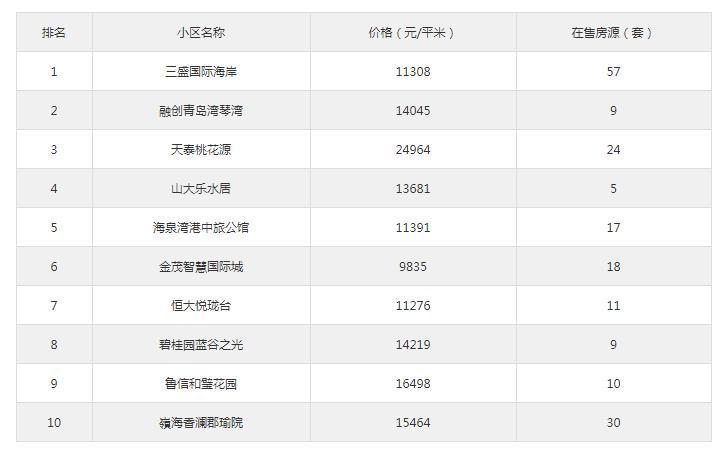 据统计,人气小区榜单中排名第一的是三盛国际海岸,目前价格11308元/平米,排名第二的是融创青岛湾琴湾,价格14045元/平米,第三名是天泰桃花源,价格24964元/平米。