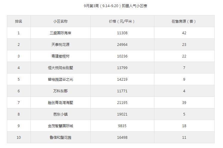 新一期即墨人气小区TOP排名出炉!房天下研究院数据显示,三盛国际海岸9月第3周(9.14-9.20)成为即墨人气最高小区。据了解,该小区位于即墨市温泉街道办事处岭海西路36号(国际博览中心北),目前价格为11308元/平米,与此同时,天泰桃花源和青建橄榄树等小区也入榜。