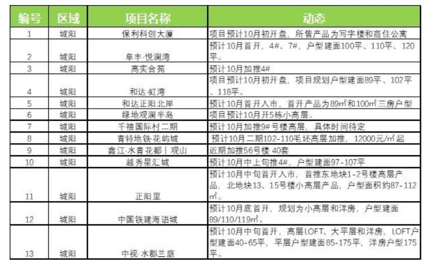 整体来说,10月推盘不减量,各项目能推尽推,对于购房者选择范围宽广,有购房需求的可以多注意。