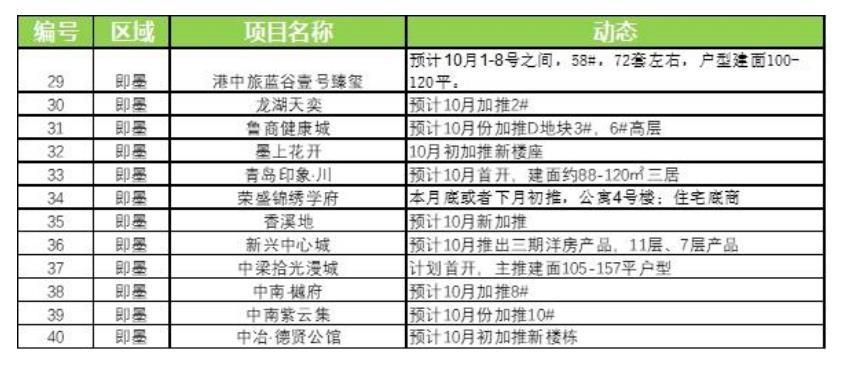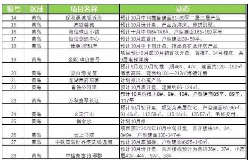 具体来,市北区保利大国璟压轴之作即将推出,纯新盘青城辰章预计10月底首开,招商碧桂园依云四季计划10月推新;李沧方面佳源双子星城、绿城伴山新组团云栖、青岛印象滟等有动作;崂山区10月计划推新的以华新园东宸府、海信北涧山居、鲁商蓝岸丽舍等盘为主。