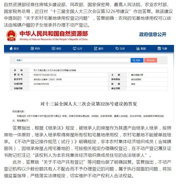 明确了!农村宅基地使用权 城镇户籍子女可继承!
