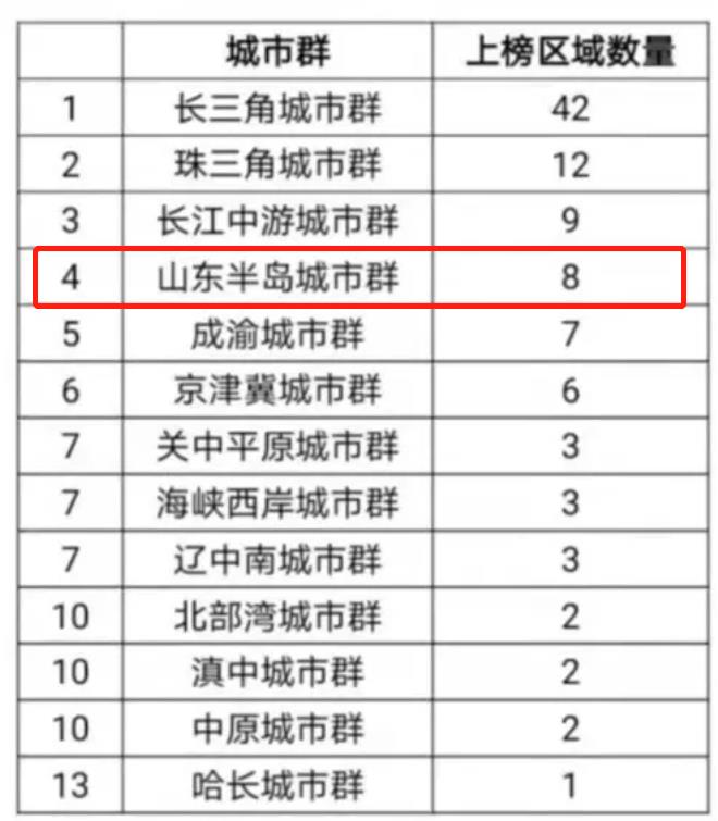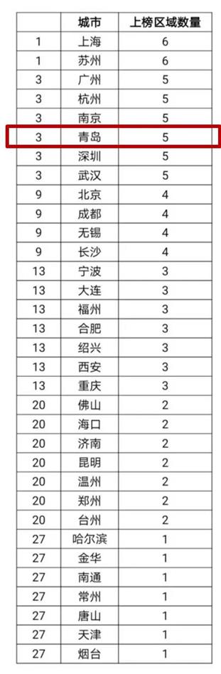 从上榜区域所在城市群来看,位于长三角城市群的区域最多,共有42个;山东半岛城市群居第四位,有8个区域入围;青岛占5席,市南区、黄岛区、城阳区、即墨区、胶州市5个区域上榜。