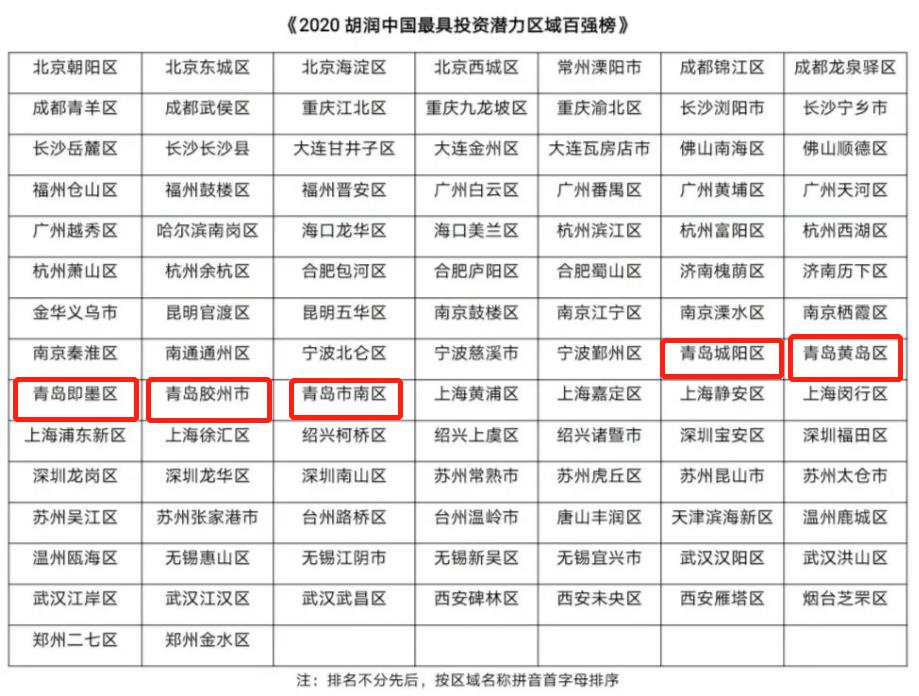 2020中国最具投资潜力区域百强榜公布!青岛胶州、黄岛、即墨、城阳、市南上榜!
