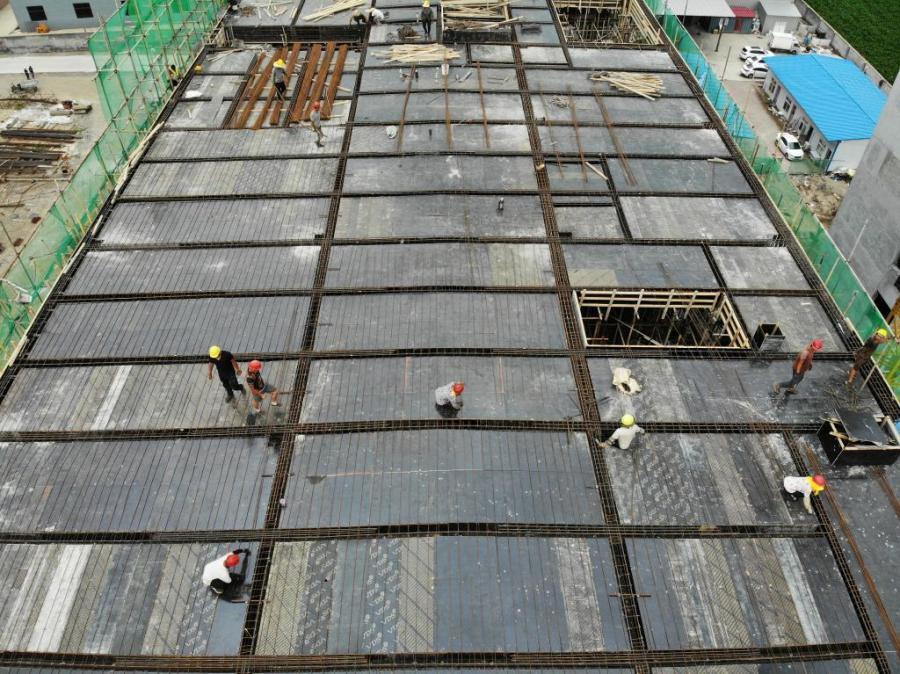 记者跟随工作人员步行攀登楼梯来到4号楼的楼顶,在楼顶上,20余名工人正在进行钢筋帮扎,“钢筋帮扎是大楼封顶前的关键步骤,完成后搅拌机就可以入场进行浇筑了,今天是绑扎的第三天,明天就能完成。”韩军云告诉记者,4号楼高约24米,因项目投产后要放置大型设备,只建设两层,也就是说每层的层高在12米左右,“层高越高,对建设的要求就越高,对木工、钢筋工、架子工的专业要求非常高,为了保证施工进度,我们及时补充专业人员,每天现场作业人员保持在近60余人。”