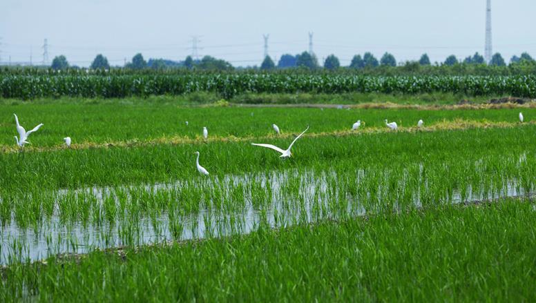 连片优质水稻田里,数十只白鹭时而振翅起飞,时而穿梭稻田觅食,时而漫步田埂,成为绿色稻田里的亮丽风景线。