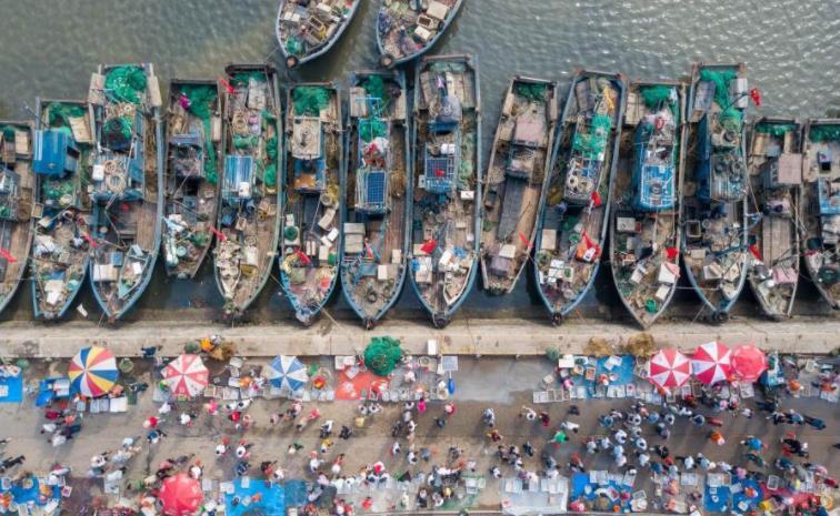 休渔期结束,即墨区田横镇田横岛村、山东头的几百艘渔船拔锚出海,在阔别四个月的渔场作业,收获满满的鱼虾。