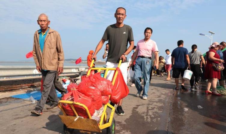 近海捕捞的渔民们都是凌晨出海,下午一点左右返港归来。整座大桥拥堵的时间也自然会从下午一点左右一直持续到傍晚。渔民王师傅表示,出海看天气,一般一月出海能有十八天左右,桥上的热闹场面和拥堵也会至少持续这些天,这种场面已经持续十多年了。
