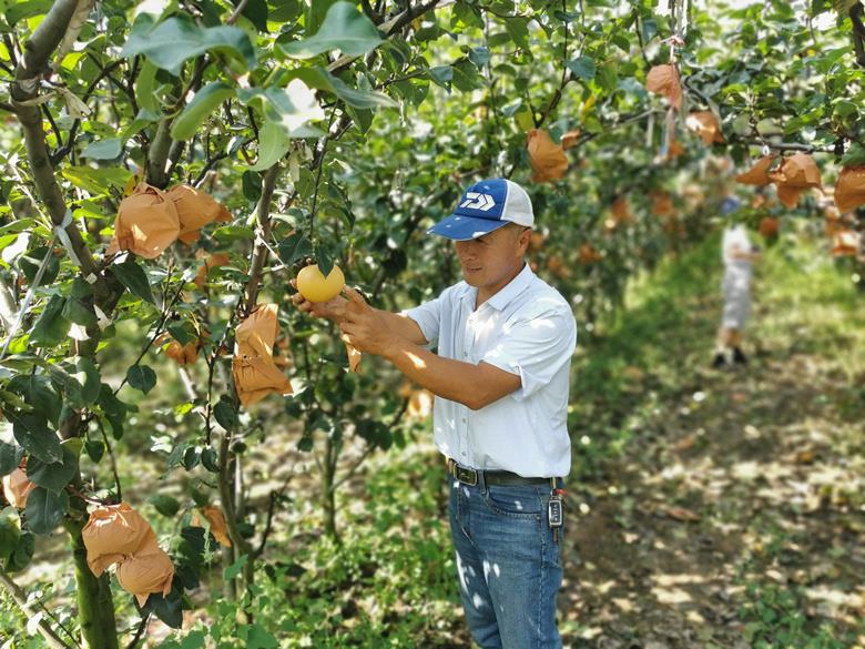 走进梨园,3米宽的圆弧形铁架两边,间隔不到1米的梨树整齐地排列,梨叶浓绿发亮,被拉成45度角的梨枝上挂了套着二层纸袋的梨果。“套袋主要目的是防止虫咬、降低病害、提高果面亮度;另外,套袋还可以让梨皮长得薄,果实水分更充足,吃起来更加甜脆爆汁。”姜仁礼介绍,最大的“秋月梨”能有1斤8两,平均一个七八两,梨子水分足、甜度高,果肉细腻无渣,核小,靠近核的位置也一样清甜。