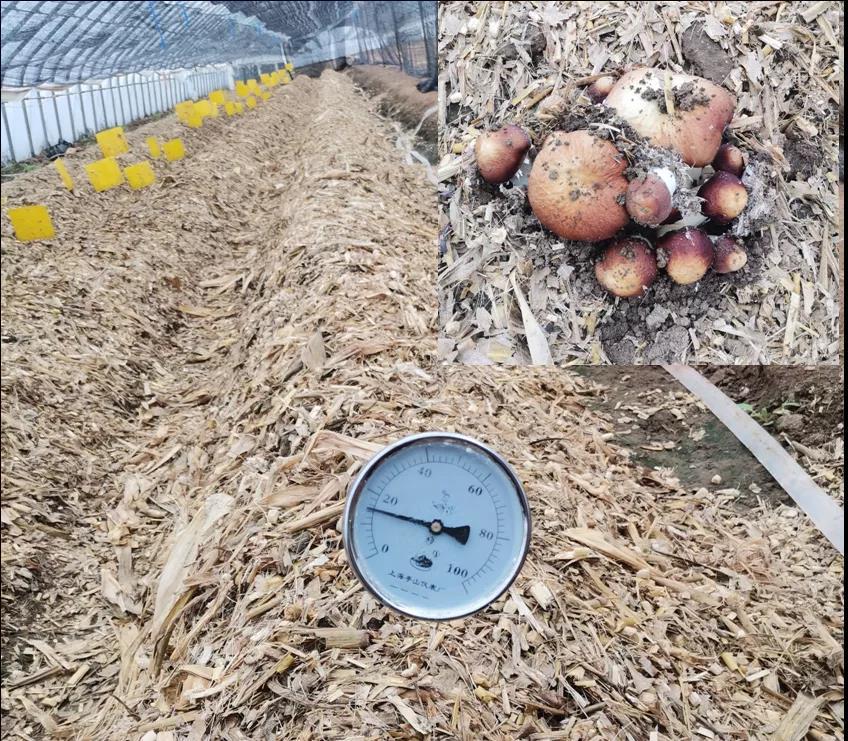 秸秆生物热气肥是对传统秸秆生物反应堆的升级改造,用全生物降解地膜包裹的方式在秋季定植时施用热气肥,冬季根据需要随时用工具打孔,扎破降解地膜,水分渗入就可以启动原料发酵,达到秸秆生物热气肥的缓释效果。它能有效提高地温,补充棚内二氧化碳浓度,使冬季设施种植作物提前上市,延长生育期,进而达到增产增收效果。