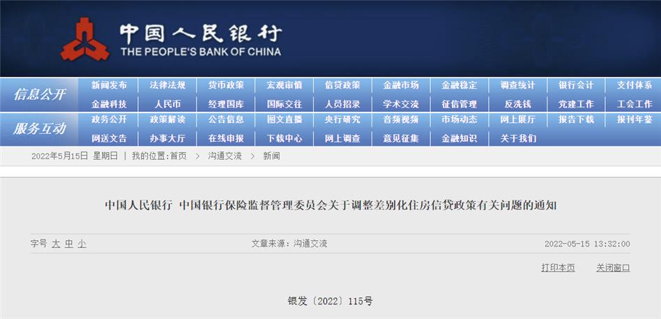 5月15日,中国人民银行、中国银行保险监督管理委员会发布《关于调整差别化住房信贷政策有关问题的通知》。