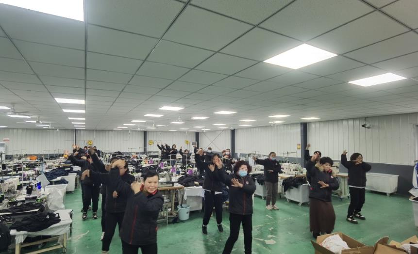 在车间内,缝纫工人放下手头的工作,开始排练