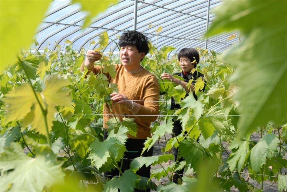 在移风店镇大坝村贸润蔬菜瓜果专业合作社内,在合作社的葡萄大棚内,工人吴芳、辛秀芹正在修剪整理葡萄枝条。据介绍,棚内种植的藤稔葡萄上市早、果实饱满、甜度高,亩产量超6000斤。“每年五月上旬,葡萄一下来,只要在我们的客户微信群里一发咱家的葡萄熟了,客商们都纷纷上门收购,每年都能卖上25元一斤。”辛秀芹喜滋滋地介绍。