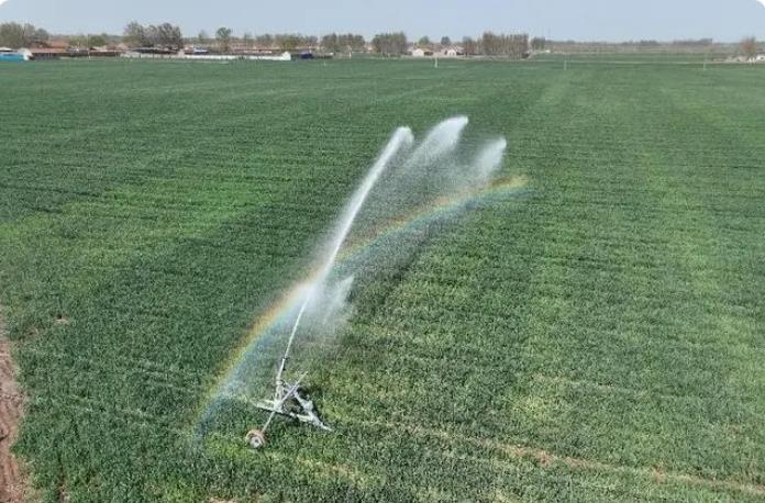 农民利用自走式喷灌机在浇灌小麦。(来源:即墨区委宣传部)