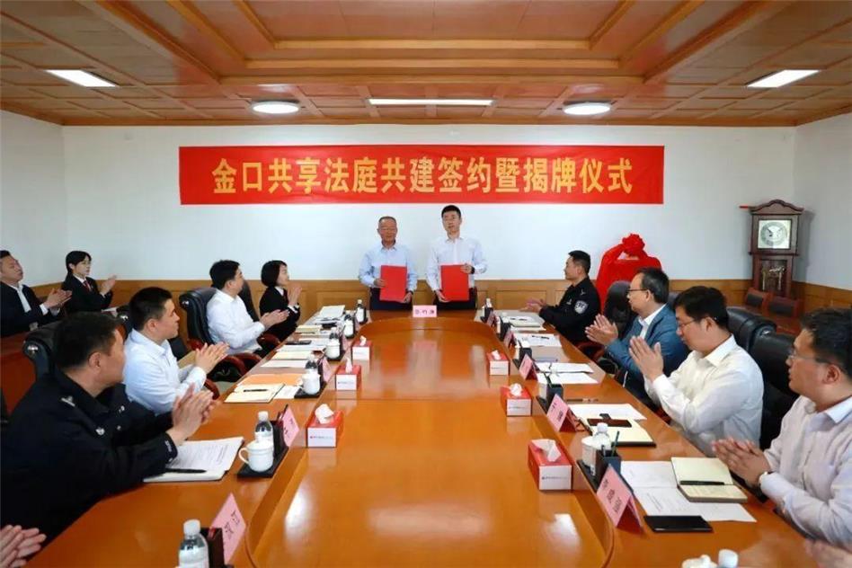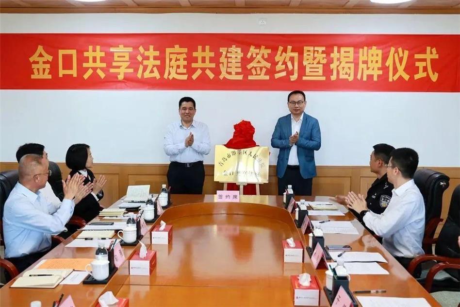 仪式上,即墨法院与金口镇签订了共享法庭共建协议,陈刚、李钊共同为即墨法院金口共享法庭揭牌。在随后召开的座谈会上,鳌山法庭、店集派出所、金口派出所、金口司法所、神山埠村调解小组等依次发言,各方就共同推进共享法庭建设进行深入交流。