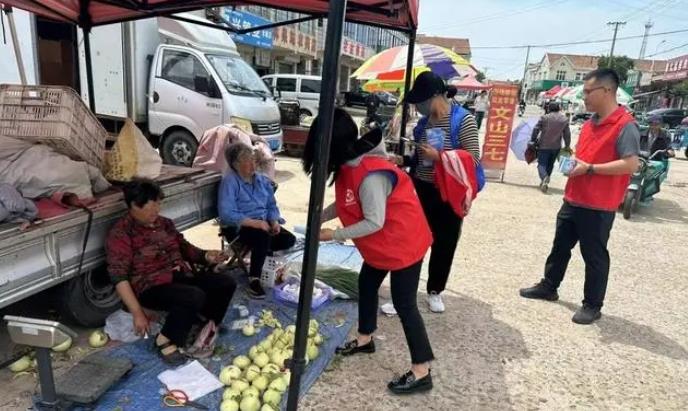 工作人员在店集大集发放宣传材料。(来源:即墨区司法局)
