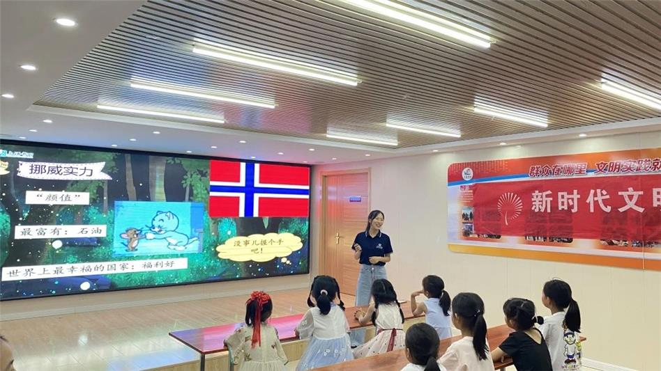 在课程中,刘老师首先通过提问的方式,吸引孩子们对故事内容的兴趣,接着详细介绍了故事作者的生平、风格及代表作,并对作者的家乡挪威和故事的主角鸭子的相关信息进行了拓展延伸,最后在老师的引领下,孩子们对故事内容有了更深入的理解。