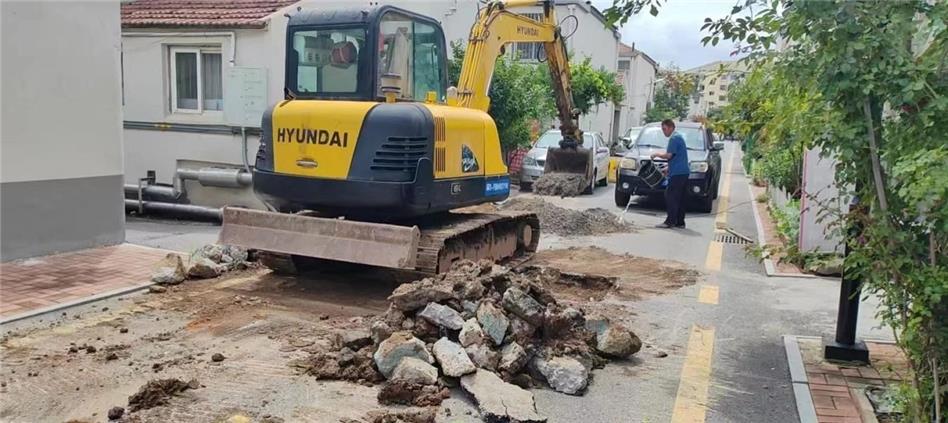 得知情况后,社区迅速响应,立即安排工作人员和网格员前往现场进行调查。随后联系物业,动用疏通长杆和高压水枪进行了多次疏通尝试,但均未果。经进一步检查周边污水井,工作人员怀疑管道可能存在断裂点。为彻底解决问题,社区随即通过街道“社区吹哨科室报到”工作机制对接园林环卫服务中心,动用挖掘机等专业设备破路,深入查找排污管道断点,最终仅用半天时间便顺利重接污水管道,恢复路面原貌。