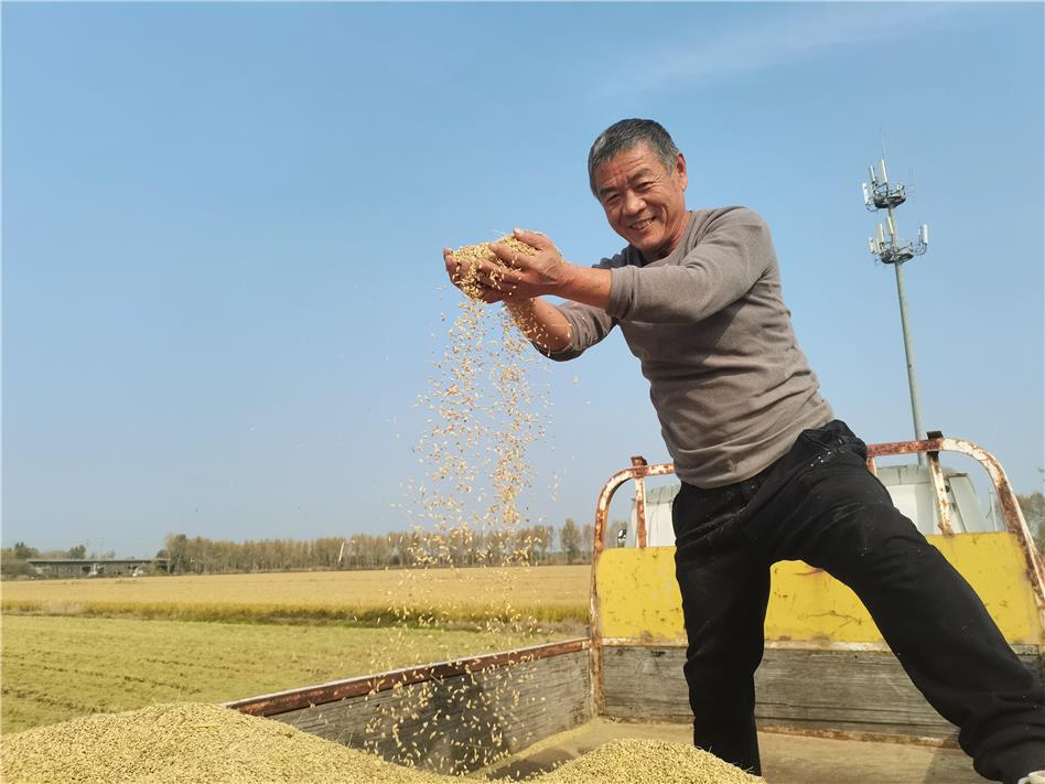 “今天收割的水稻最高亩产达到了1200斤,质地和口感都很好。”据当地稻农介绍,目前除了合作社种植的1000多亩水稻外,周边村庄的村民也开始种植水稻。合作社免费提供技术支持,为村民们提供育苗、插秧、收割和平时管理维护的“一条龙服务”,成功恢复了蓝村盐碱地水稻的种植。
