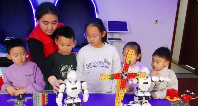 1月23日,社区志愿者与小学生在青岛市即墨区环秀街道墨香郡社区科普馆里与机器人互动。寒假期间,青岛市即墨区环秀街道免费开设书法、剪纸、阅读、兴趣机器人等“寒假快乐课堂”,许多孩子走进即墨区环秀街道墨香郡社区科普馆学习科学知识和才艺,孩子们在丰富多彩的活动中增长知识、强身健体、感受传统文化魅力,在快乐学习中度过多彩假期生活。