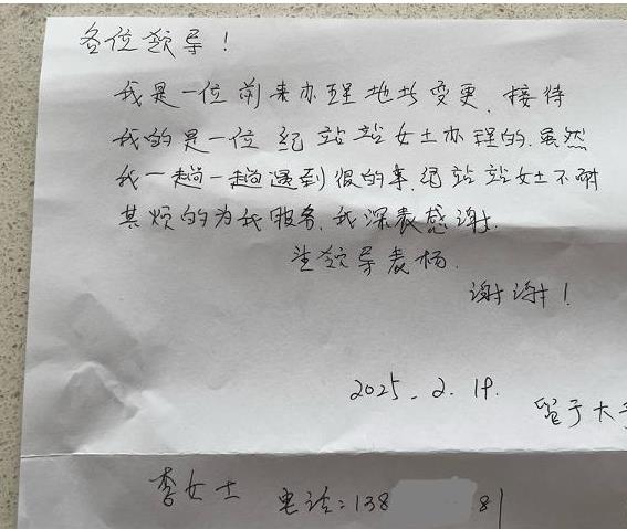 据了解,李女士要跨区域办理个体营业执照地址变更手续,因办理材料准备不足,遇到问题较多,纪站站一一讲解,手把手指导其补充信息、提交材料,并主动提供延时服务,使李女士当天完成审批。这封情真意切的信件,背后是即墨区践行服务型政府理念的生动缩影。