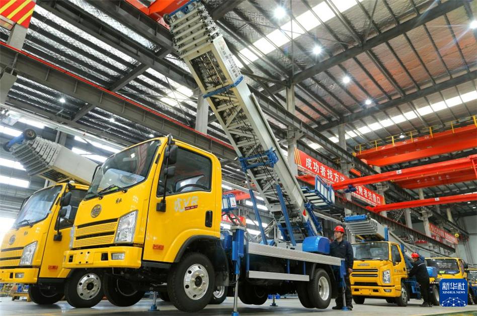 3月16日,在即墨区金口镇的一家特种车生产企业,员工在调试云梯车。