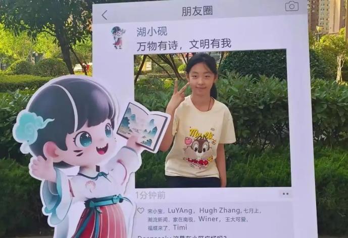 “砚砚子,看这里!”孩子们争相与她合影,而这位“00后国风少女”早已不仅是卡通形象——她是社区的新晋“顶流”,是居民群里的表情包霸主,更是滨湖社区“书香共享、文明共育”理念的鲜活代言人。