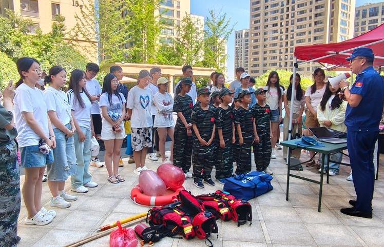 活动的重头戏当属即墨蓝天救援队在小区室外泳池进行的逼真溺水救援科目模拟演示。救援队员先后演示了近岸低身位救助、活饵救援、抛绳包技巧展示三种专业救援方式,整个模拟过程紧张逼真,环环相扣,赢得了在场青少年、大学生志愿者和居民们的阵阵掌声与惊叹。演示期间,救援队员还向观众展示并讲解了救生圈、救生衣等专业防溺水及救援装备,让大家对这些“生命守护者”的装备有了更直观的认识。