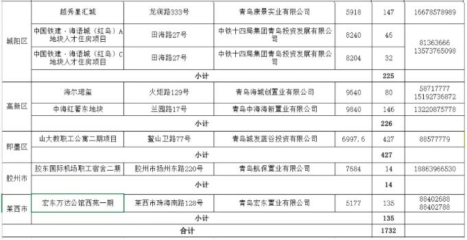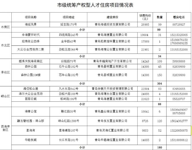 小编注意到,情况表中包括市南区1个项目、市北区3个项目、李沧区3个项目、崂山区3个项目、西海岸新区4个项目、城阳区3个项目、高新区2个项目、即墨区1个项目、胶州市1个项目、莱西市1个项目。名单中既有这些在售产权型人才住房项目的名称、具体地址,还包含建设单位、销售均价、数量以及看房电话。