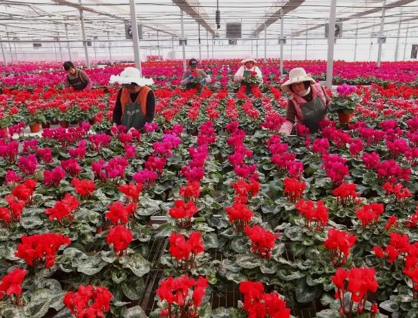 近日,山东省青岛市即墨区灵山街道花卉大棚里一片忙碌,种植户们忙着管护和销售花卉。近年来,即墨区灵山街道因地制宜推动花卉产业标准化、规模化、智能化发展,依托“龙头企业+农户”联农带农机制,大力发展花卉种植,打造集组培育苗、现代化种植、电商销售于一体的产销模式,带动农民增收,助力乡村振兴。