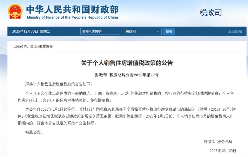 本公告自2026年1月1日起施行。《财政部 国家税务总局关于全面推开营业税改征增值税试点的通知》(财税〔2016〕36号)附件3《营业税改征增值税试点过渡政策的规定》第五条第一款同步停止执行。2026年1月1日前,个人销售住房涉及的增值税尚未申报缴纳的,符合本公告规定的可按本公告执行。