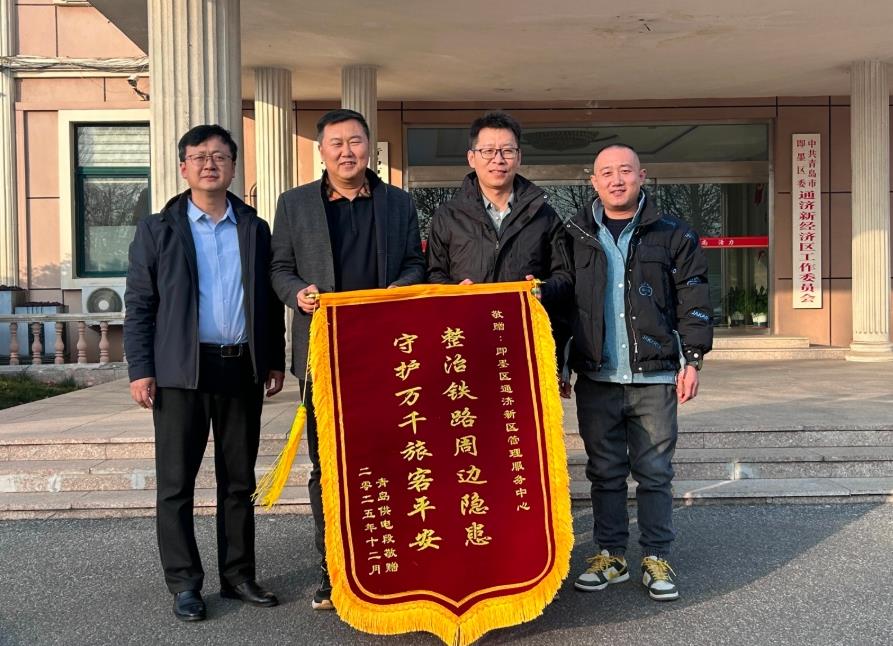 2025年以来,即墨区通济新区与中国铁路济南局集团有限公司青岛供电段不断加强沟通,在青荣城际铁路沿线整治工作中密切协作,改善了铁路沿线周边环境。近日,中国铁路济南局集团有限公司青岛供电段将一面“整治铁路周边隐患 守护万千旅客平安”的锦旗送给通济新区,对过去一年来新区在青荣城际铁路沿线环境治理中的积极贡献表示感谢,通济新区也向铁路方对新区工作的配合与支持表示感谢。