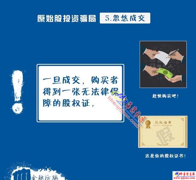 所以,普通老百姓不可能拥有合法的原始股。而通过电话、门店销售人员、网络渠道向老百姓公开销售“原始股”,实际上本身就违反了证券法“不得变相公开发行股票”的规定。即使花钱买到所谓的“原始股”,也属于私下转让,并不受法律保护,倘若企业不能如期上市登录资本市场,所谓的“原始股”便如同一张空头支票,你花钱买到所谓的“股权凭证”就是一张废纸。