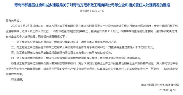3月3日,青岛市即墨区住房和城乡建设局发布于对青岛方冠市政工程有限公司等企业和相关责任人处理情况的通报。通报称,2020 年 7 月 27 日17时左右,青岛方冠市政工程有限公司在青岛市即墨区灵山产业园污水转输工程进行管道水压试验时,发生一起阀门井下作业窒息事故,造成 2 名工作人员死亡,1 名村民在主动施救过程中死亡,直接经济损失 333 万元。根据事故调查组的处理意见,经我局研究决定对有关企业和个人进行处理,现将相关情况通报如下: