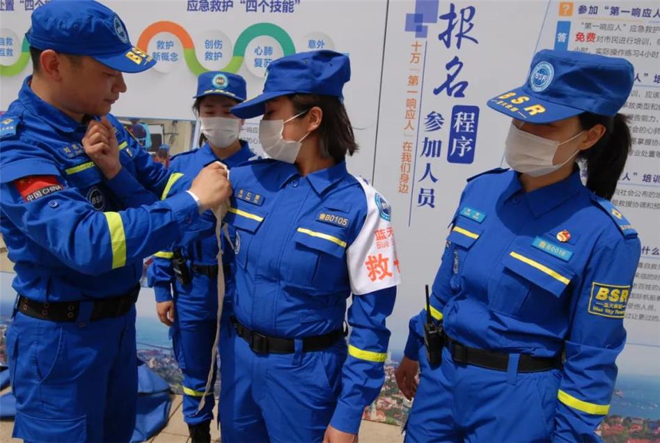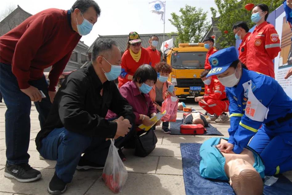 在古城戏台“第一响应人”培训现场,来自青岛市的4支“第一响应人”队伍组成方阵,现场讲解演示创伤包扎、心肺复苏、AED除颤器使用以及应急处置等救护实战操作,在广场上形成了一道独特的“寓教于学”风景线。工作人员和社区志愿者向过往群众发放防灾减灾宣传册,并用通俗易懂的语言和方式为大家讲解应急逃生、紧急避险等知识,提高居民的自救能力。
